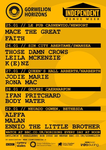 Weekday performances come from hip hop artist Mace the Great, country singer Jodie Marie, rock band Those Damn Crows, R&B singer Faith, urban brother & sister Leila McKenzie and K(e)nz, singer-songwriter Rona Mac, lo-fi / spoken word artist Ennio The Little Brother, blues rock pairing Alffa, electro pop artist Malan, new duo Body Water and a solo performance from Gwilym frontman Ifan Pritchard. Additionally, the weekend brings more Welsh rock from Holding Absence on Saturday 30th and Junior on Sunday 31st.