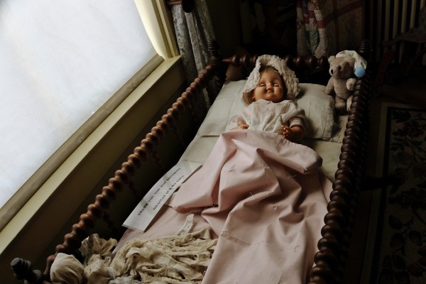 A well-preserved baby doll, washed in the afternoon light, kept safely in its cradle.